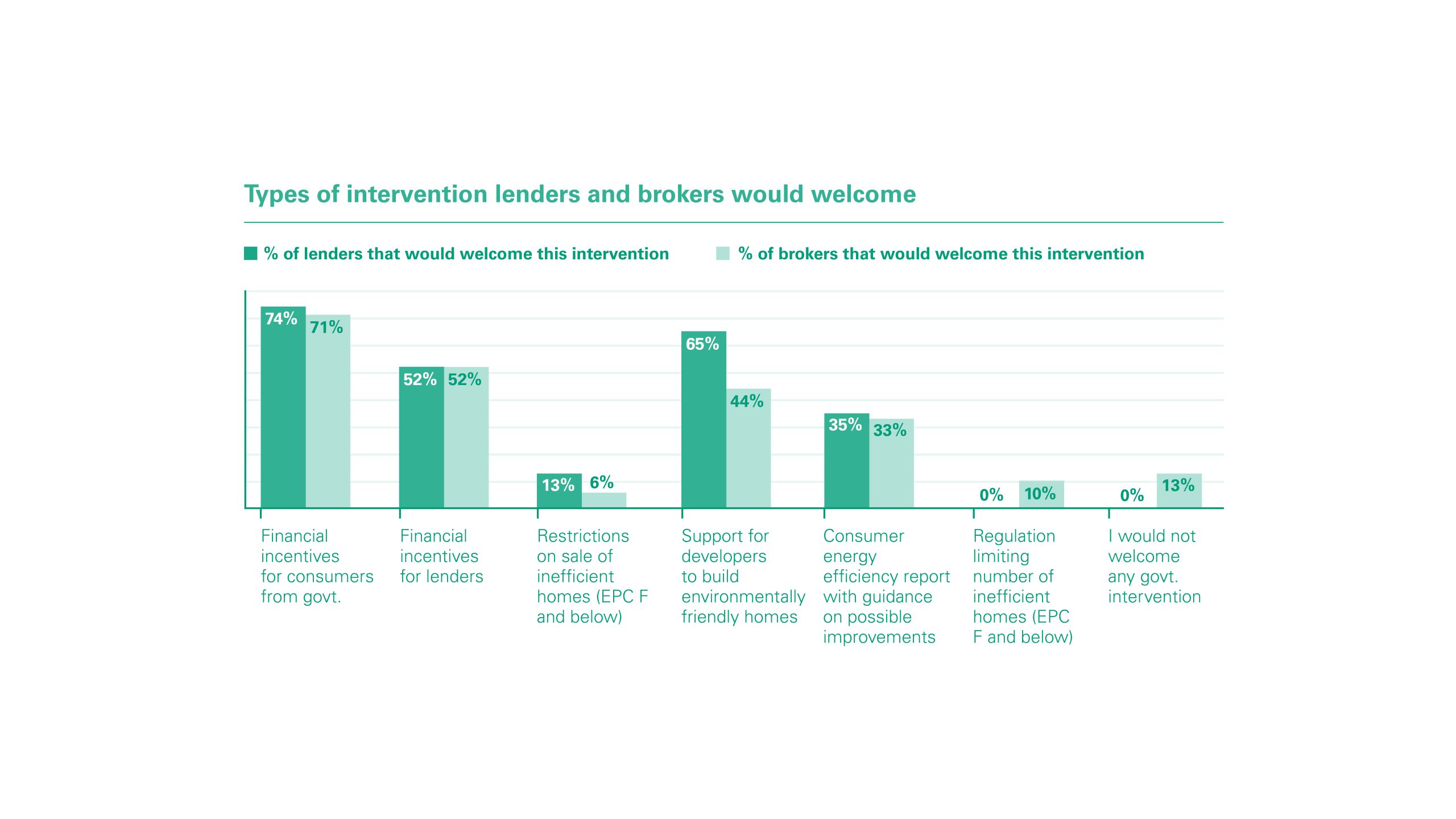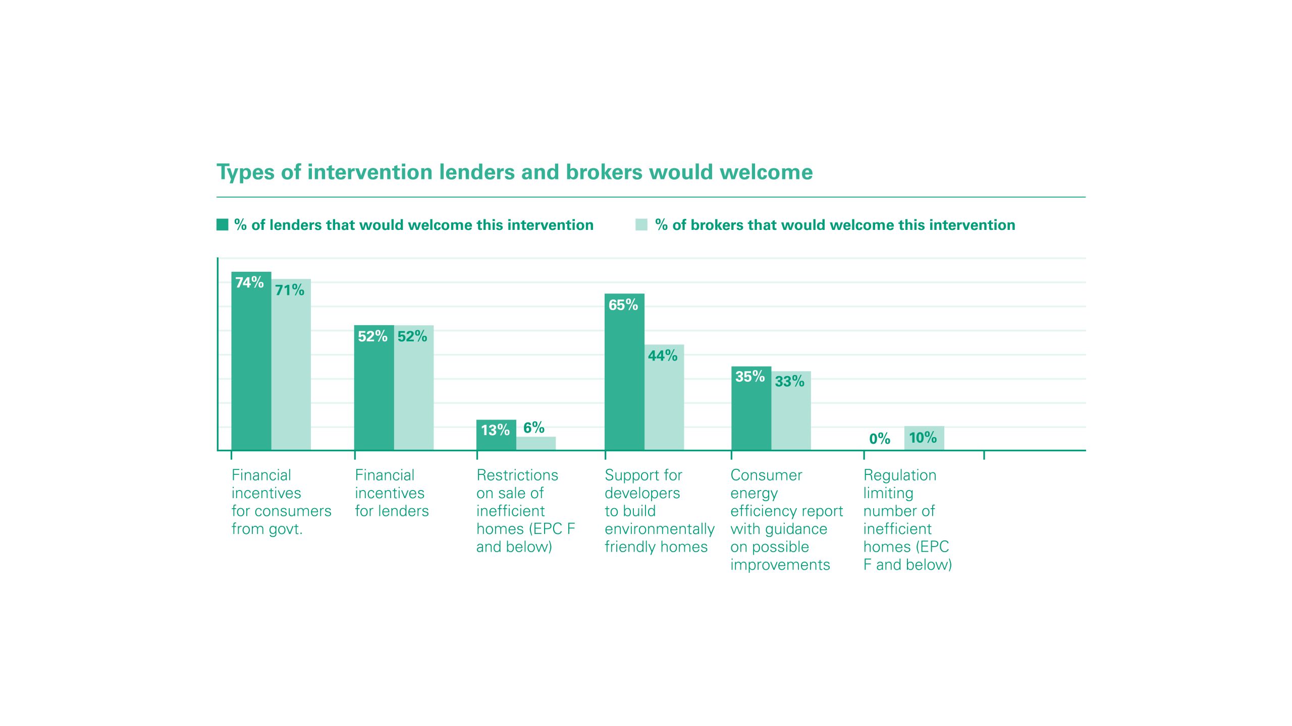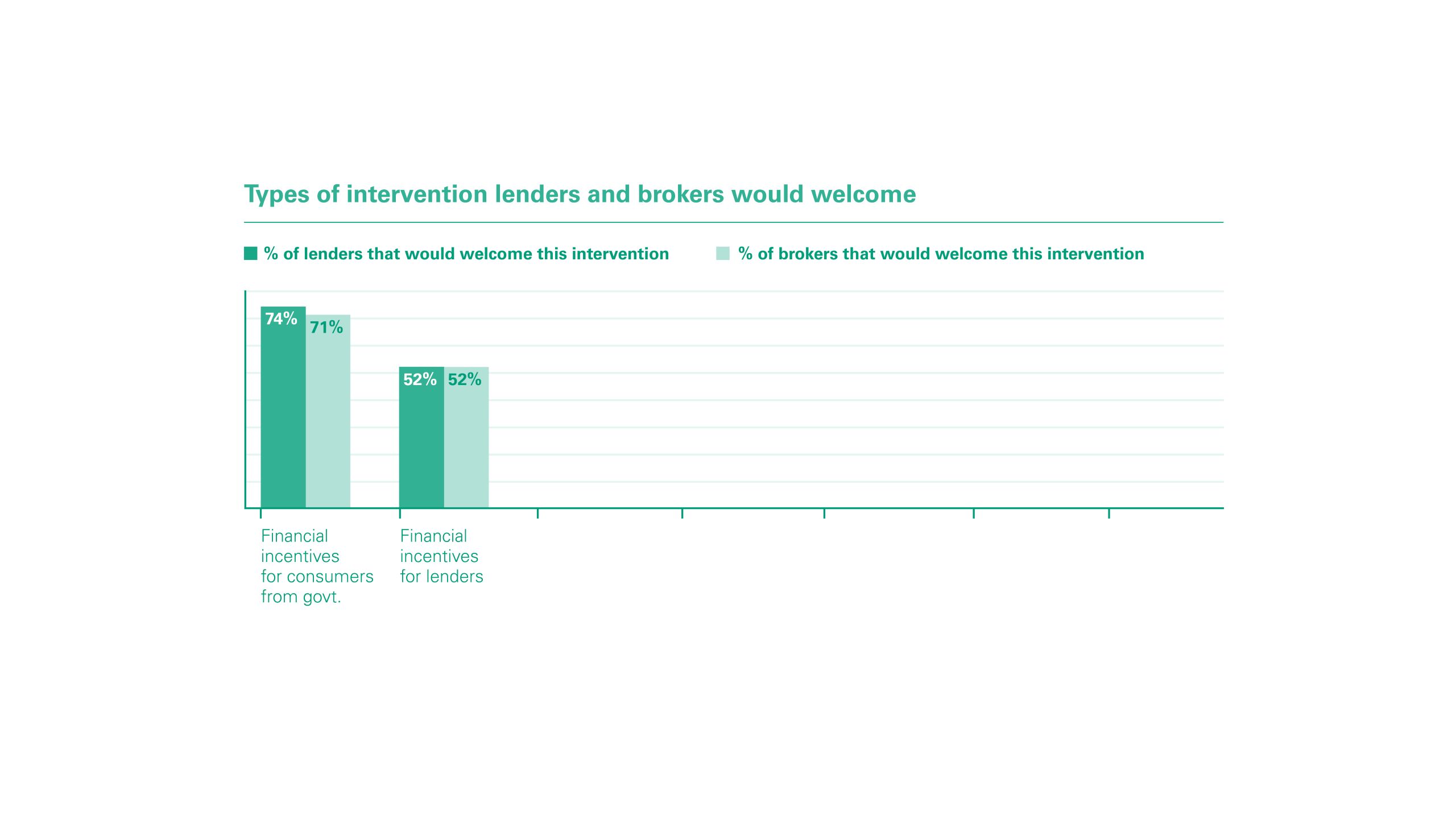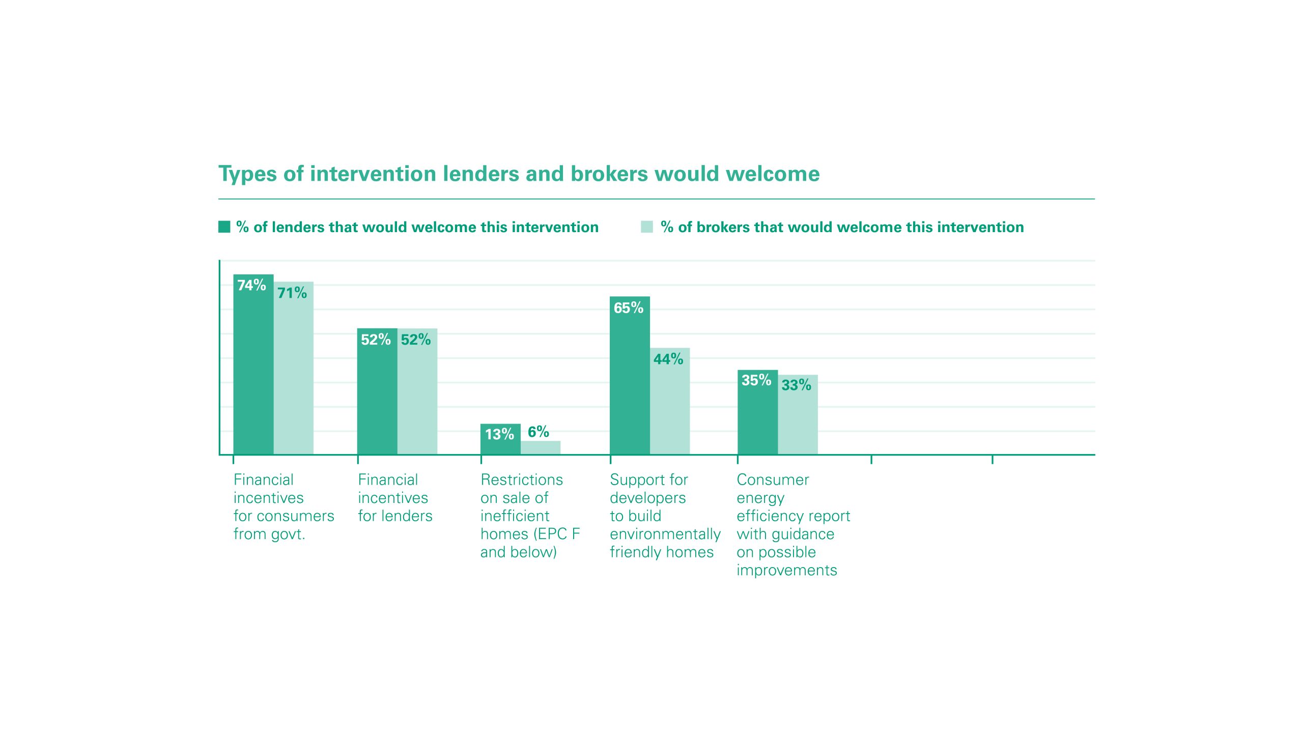 Another often cited barrier to the development of the sector is the lack of financial incentives from government, with 74% of lenders of the belief that this plays a key role in helping the market to move forward.