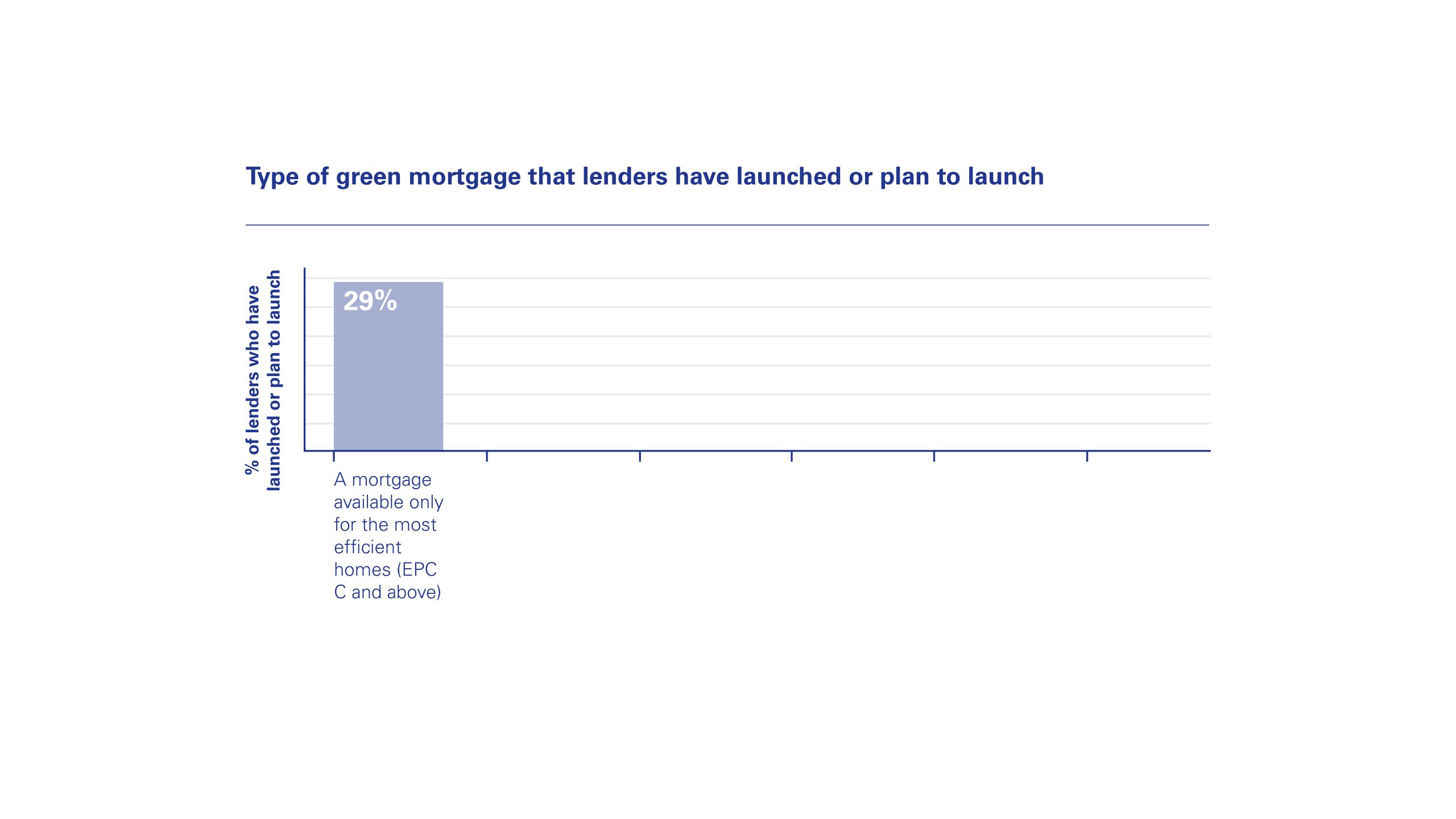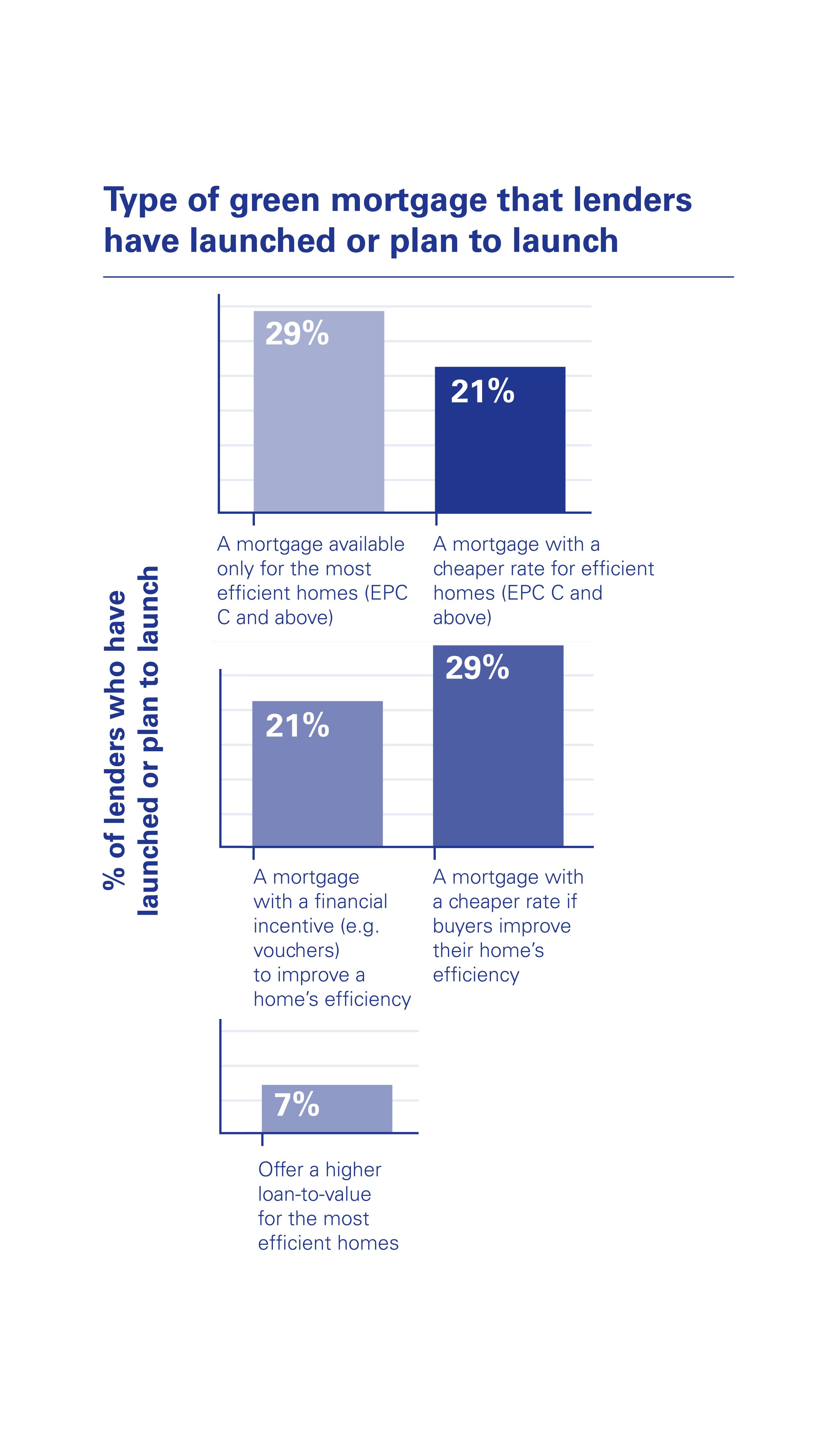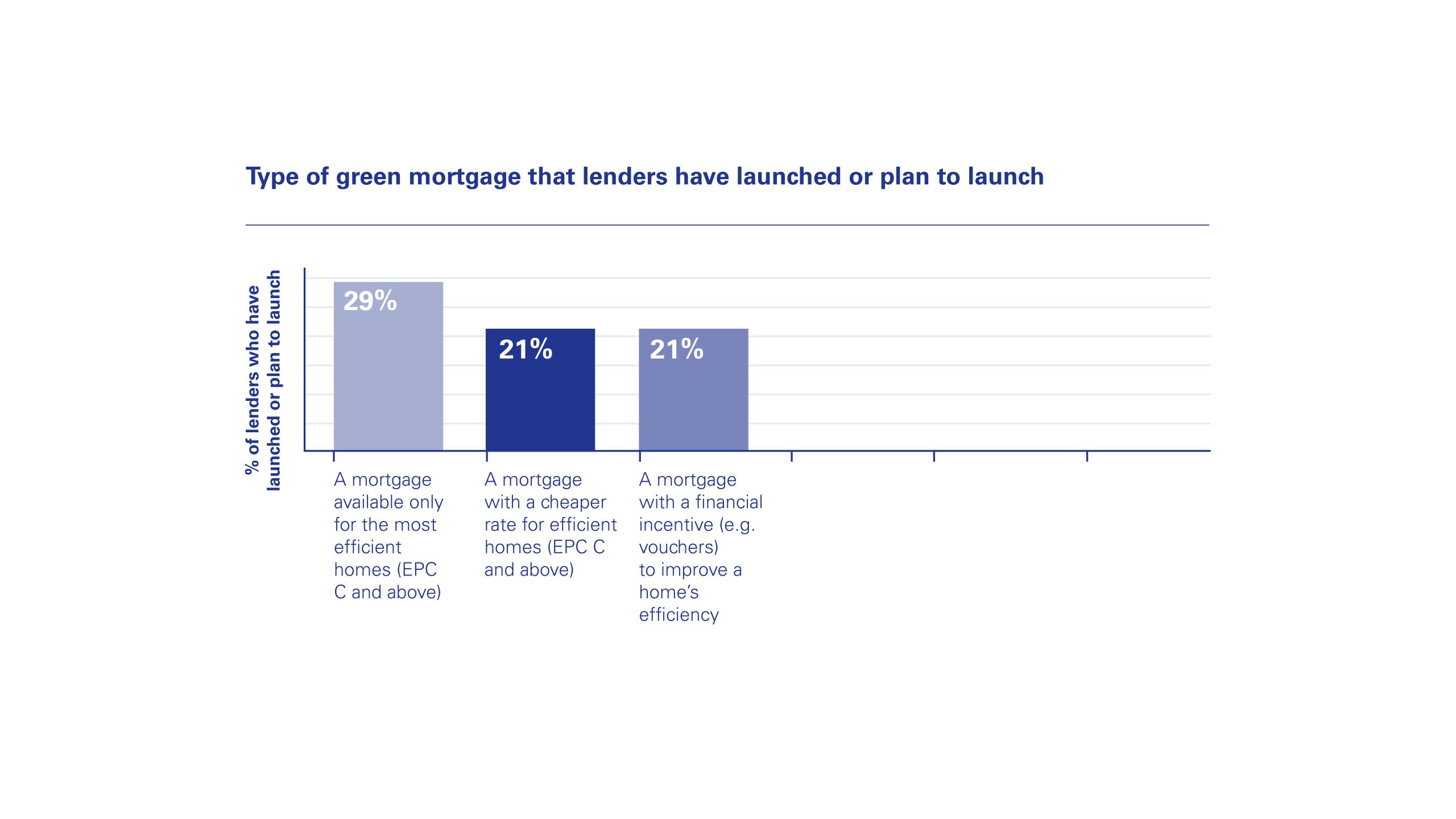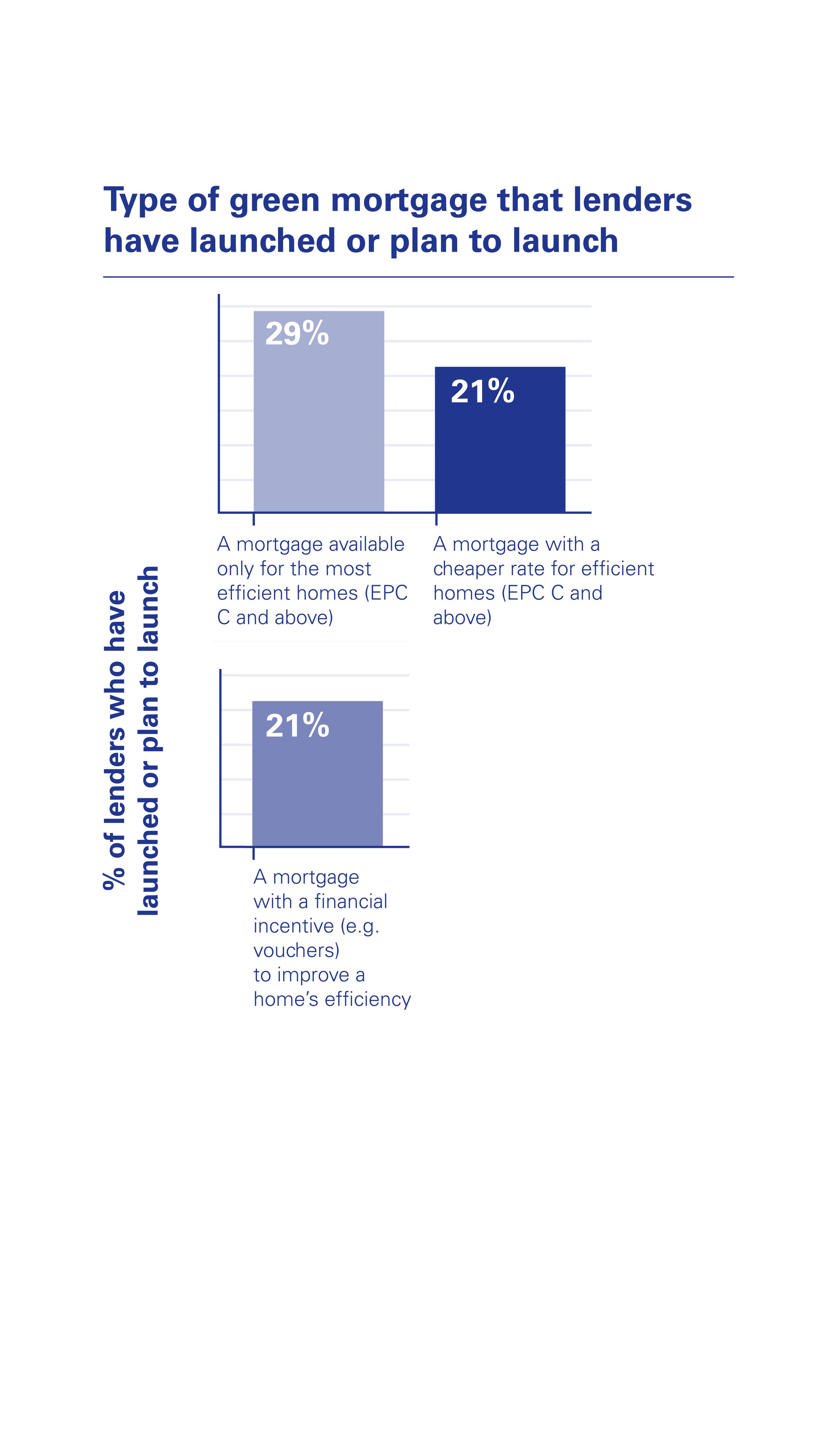 Interestingly, over a quarter (29%) of lenders surveyed said they had launched or planned to launch a mortgage that is only available to properties with an EPC C rating and above. A mortgage that provides a financial incentive such as vouchers for buyers to make their homes more energy efficient was outlined as being a key product feature by 21% of lenders when launching a green mortgage offering
