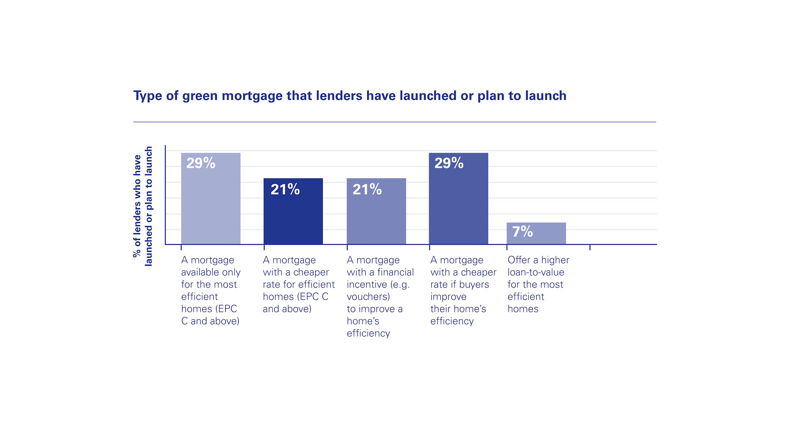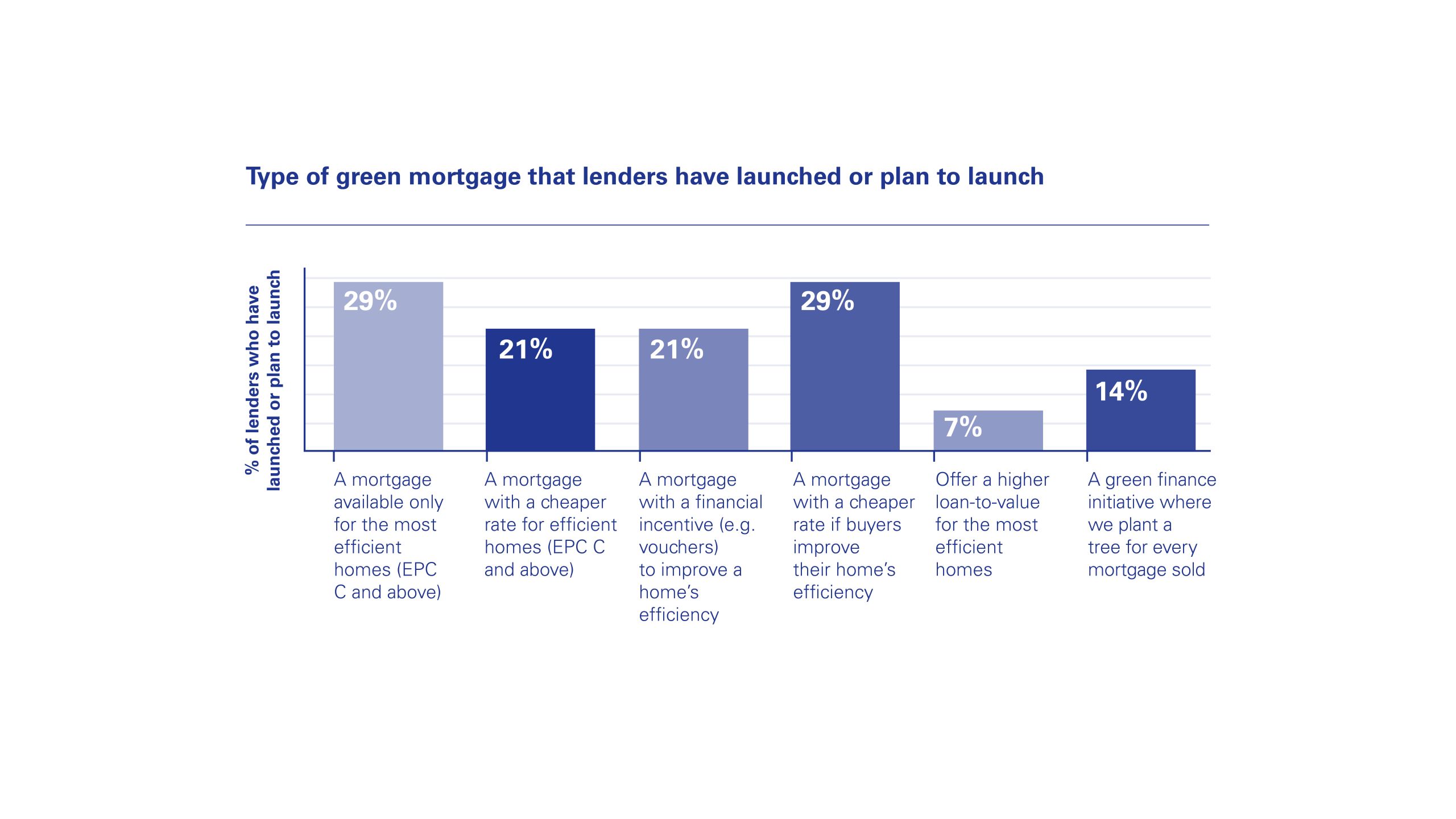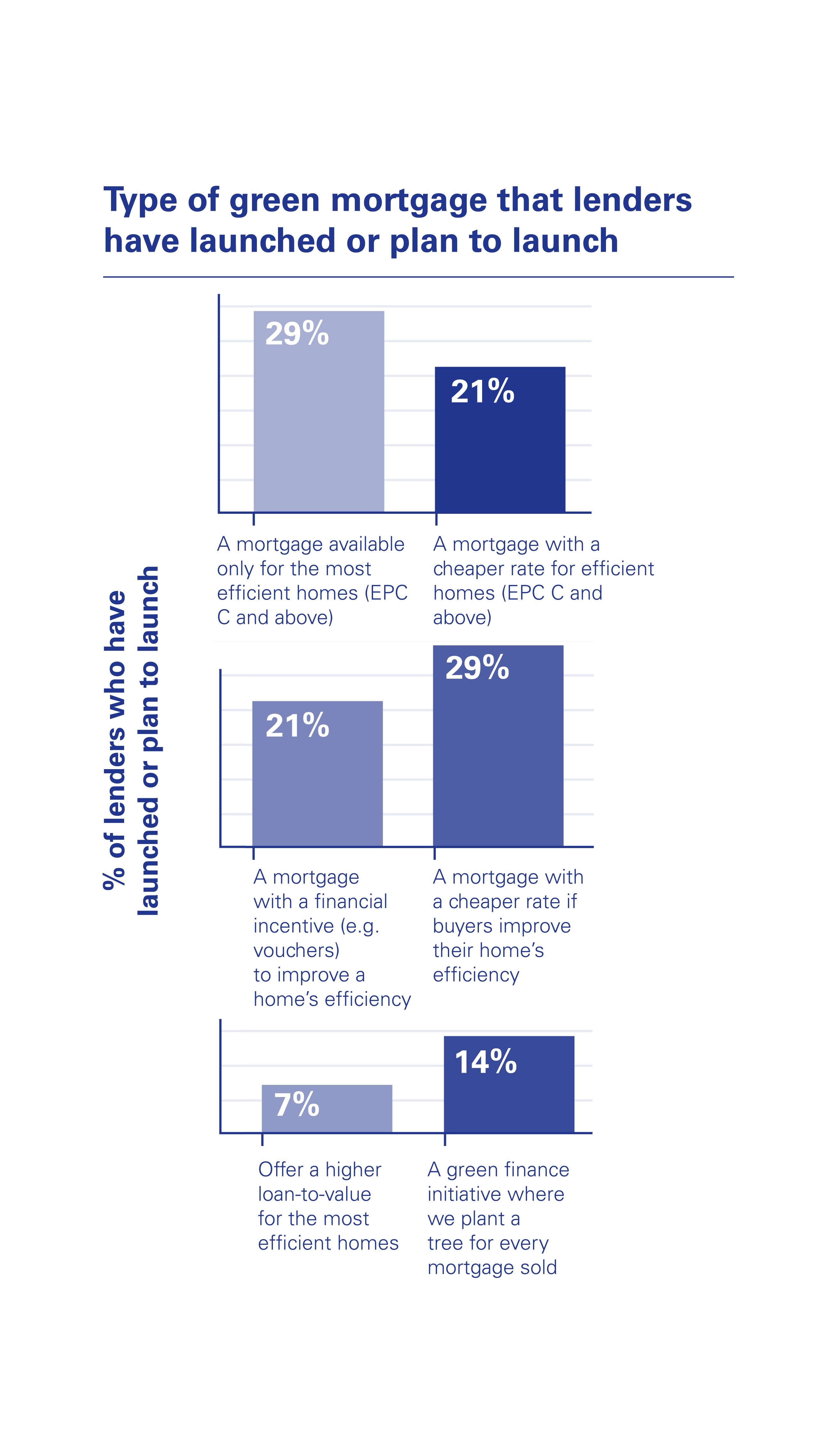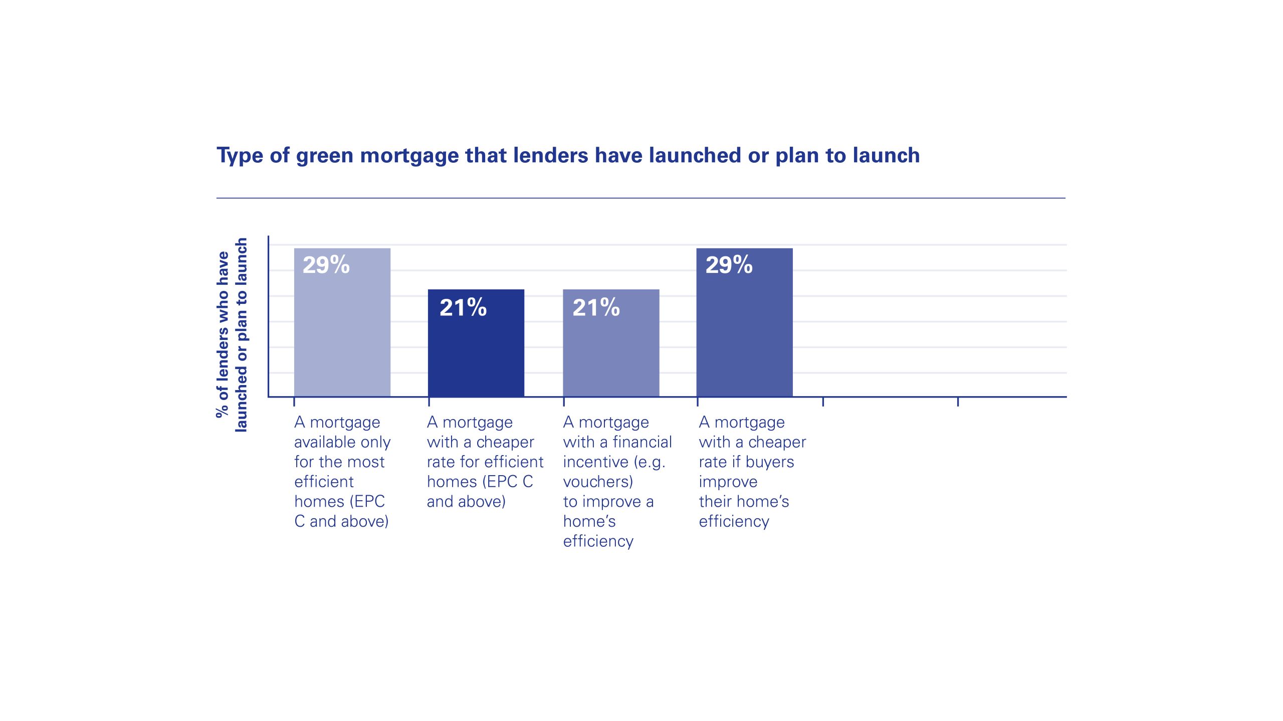 Interestingly, over a quarter (29%) of lenders surveyed said they had launched or planned to launch a mortgage that is only available to properties with an EPC C rating and above. A mortgage that provides a financial incentive such as vouchers for buyers to make their homes more energy efficient was outlined as being a key product feature by 21% of lenders when launching a green mortgage offering