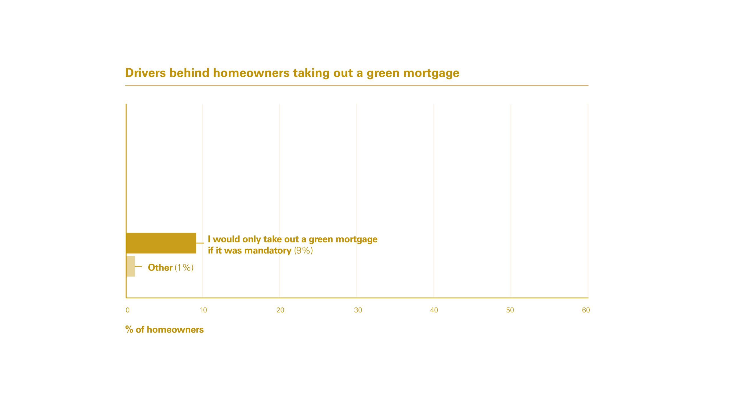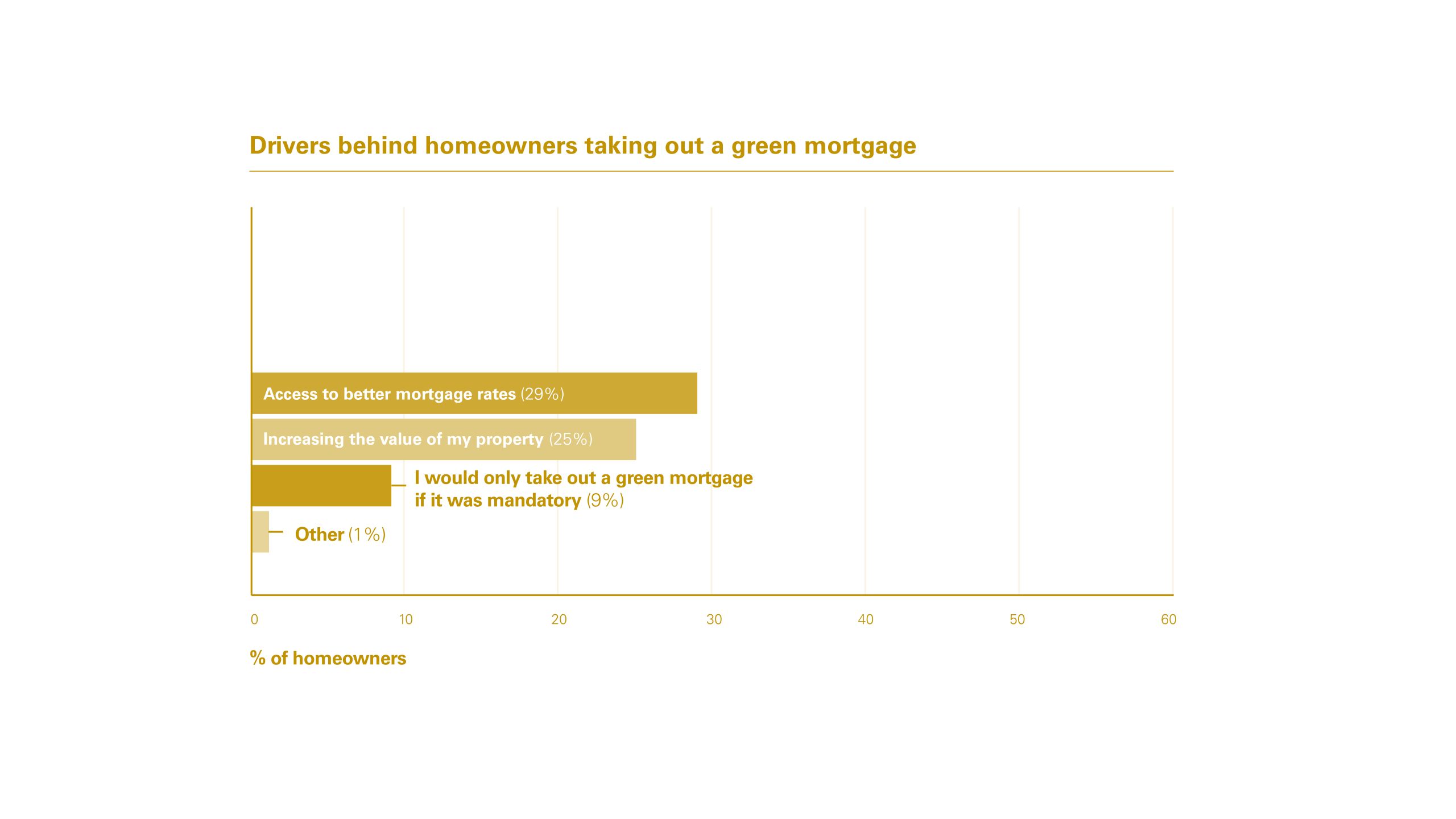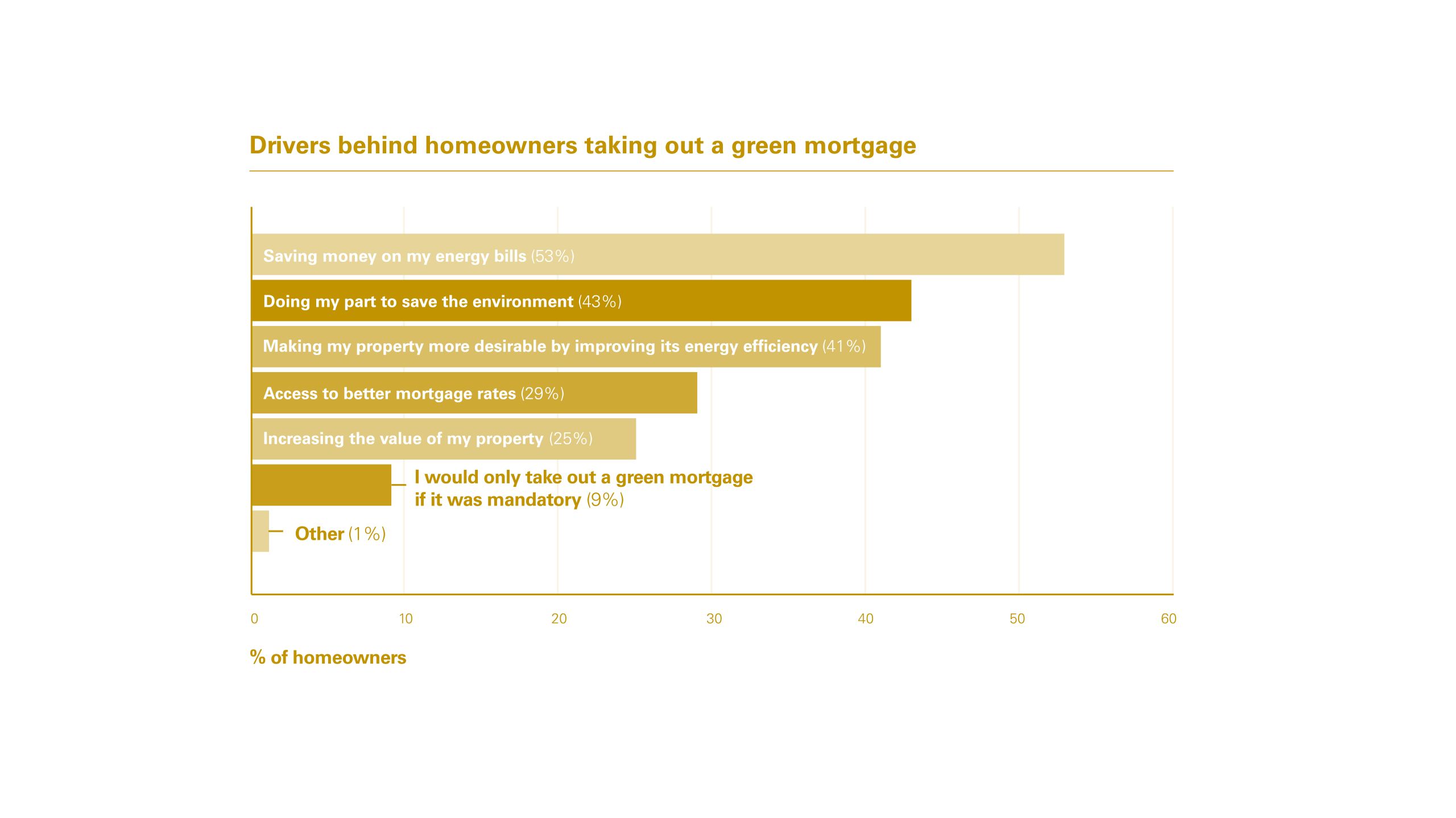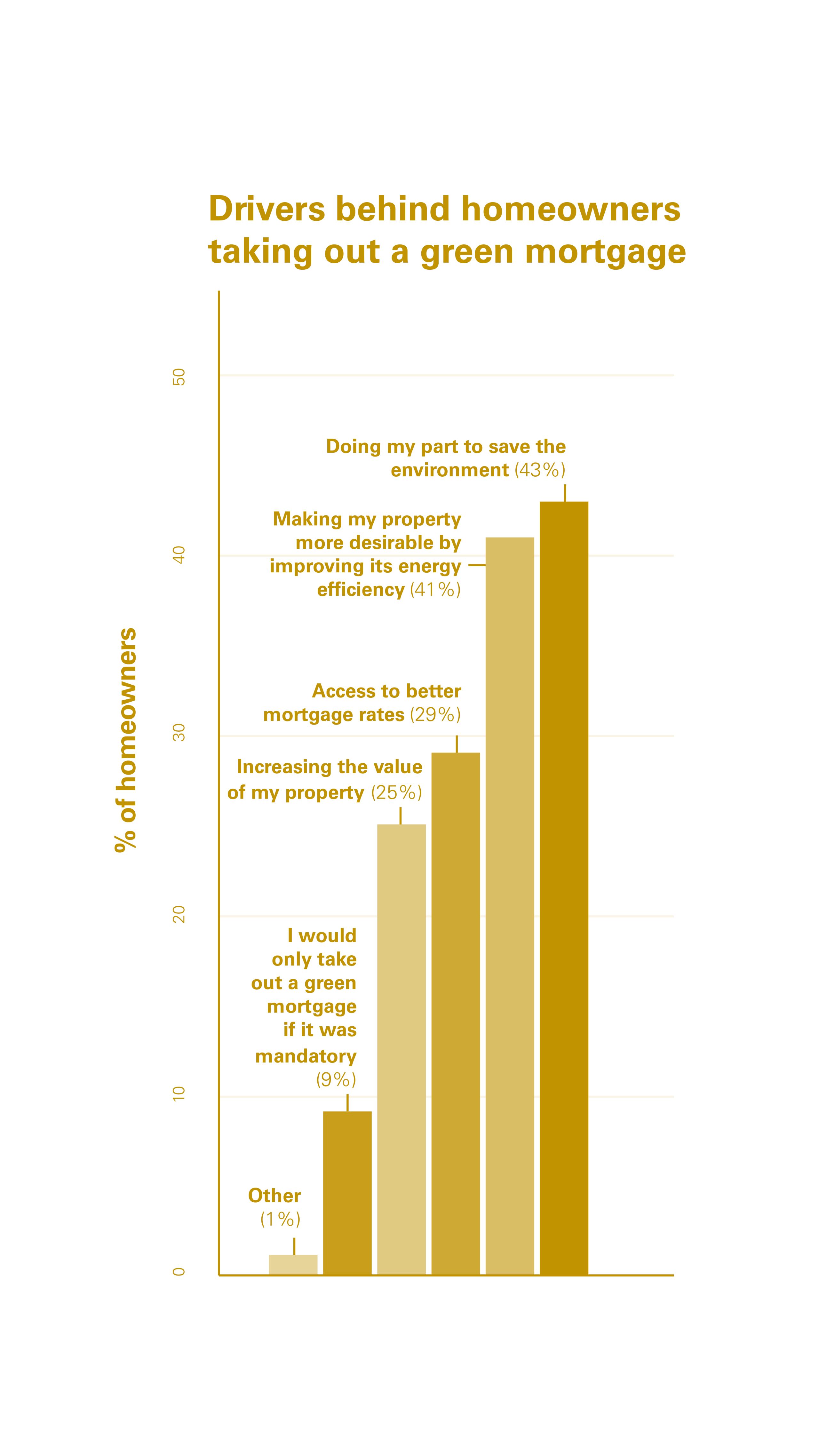 Indeed, saving money on energy bills was in fact cited as the biggest driver behind the preparedness to take out a green mortgage by 53% of consumers, followed by making energy improvements to their homes (43%). Accessing better mortgage rates was cited as a key driver for 29% of consumers, with just 9% of borrowers saying they would only take out a green mortgage if it were mandatory.
