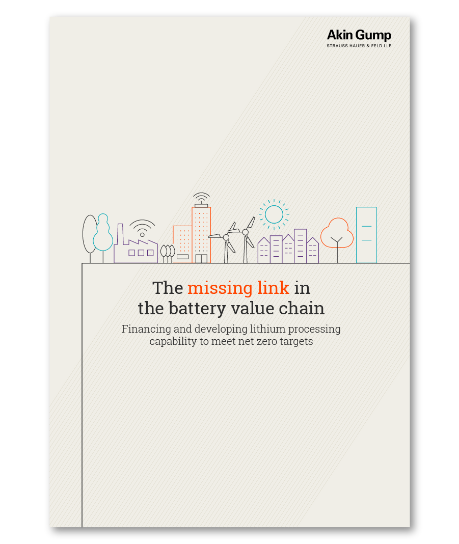 Some of the projects coming to market contemplate a ‘closed loop’ lithium solution, whereby a single company will develop a lithium mine and use the raw material produced from its mine as feedstock for its own processing and conversion facility. This has the potential to address certain issues regarding feedstock availability and specification but creates complexity, including ‘project on project risk’. Akin has experience addressing ‘project on project risk’ in the context of LNG (liquified natural gas), clean hydrogen and ‘infra off resource’ transactions. All of these are highly relevant precedents in the context of a closed loop lithium business.