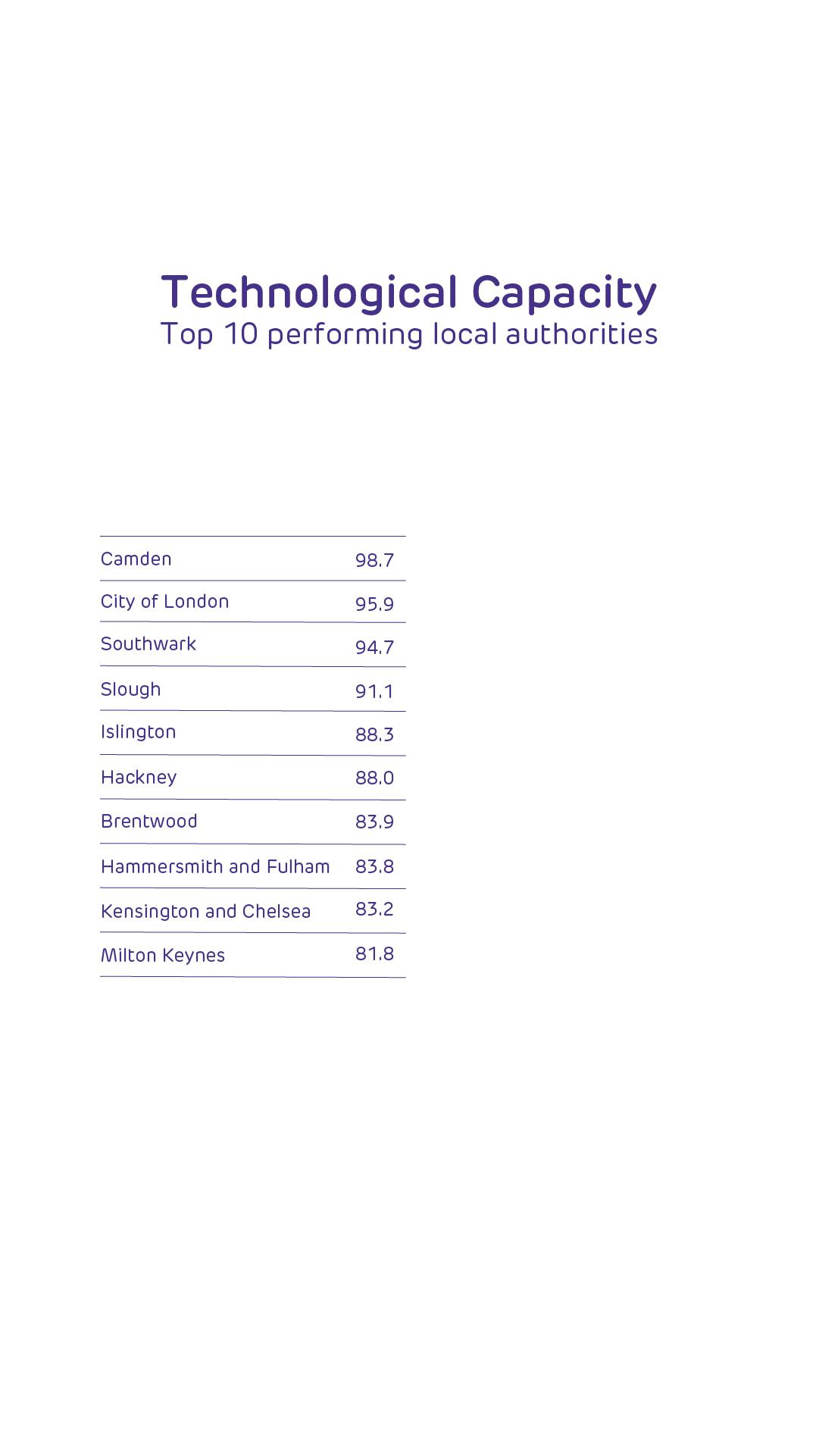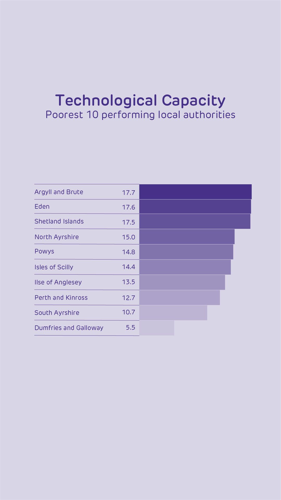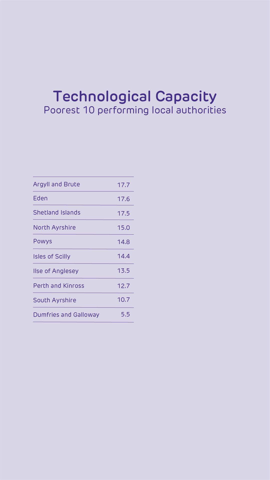 Despite this, when it comes to local authorities, the capital still dominates, with London boroughs accounting for the majority of the top ten as a consequence of its strength as a digital hub. Scottish local authorities, meanwhile, are some of the poorest performers. This is mainly a result of much smaller digital sector workforces, while Dumfries & Galloway (the only area to post a single-digit score) suffers due to its low internet-user prevalence.