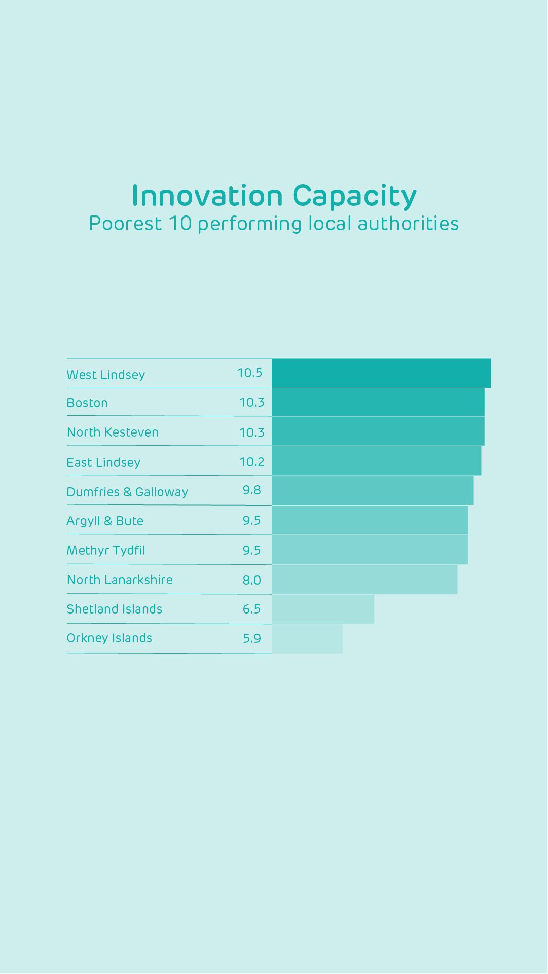 The West Midlands (47.3) scores higher on this pillar than the South West (46.1), showing that regions outside the South can compete when it comes to workforce skills. Despite its rural and coastal populations, Scotland’s score of 50 is in line with some higher-ranking regions in the South of England and above the South West. And, unlike on the innovation pillar, Scottish councils don’t feature in the bottom ten at all.