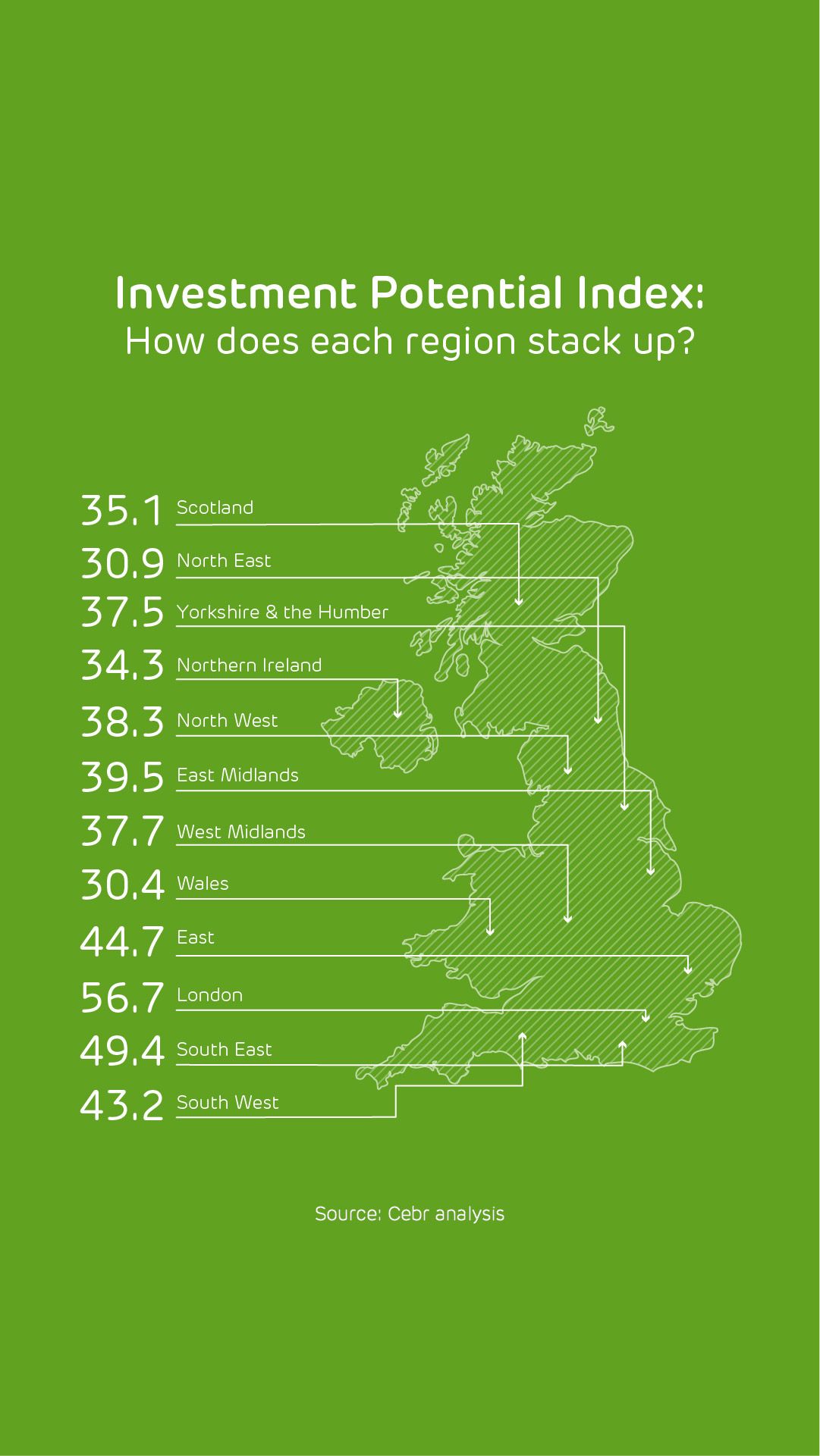 While half of the top 10 performing local authorities were in London, which traditionally receives the lion’s share of investment, a regional breakdown shows other regions have greater potential. The capital’s score of 32.9 was beaten by the South West (34.6), for instance. Equally surprisingly, the South East (30.1), trailed the North West (30.4) and Yorkshire and the Humber (30.8).