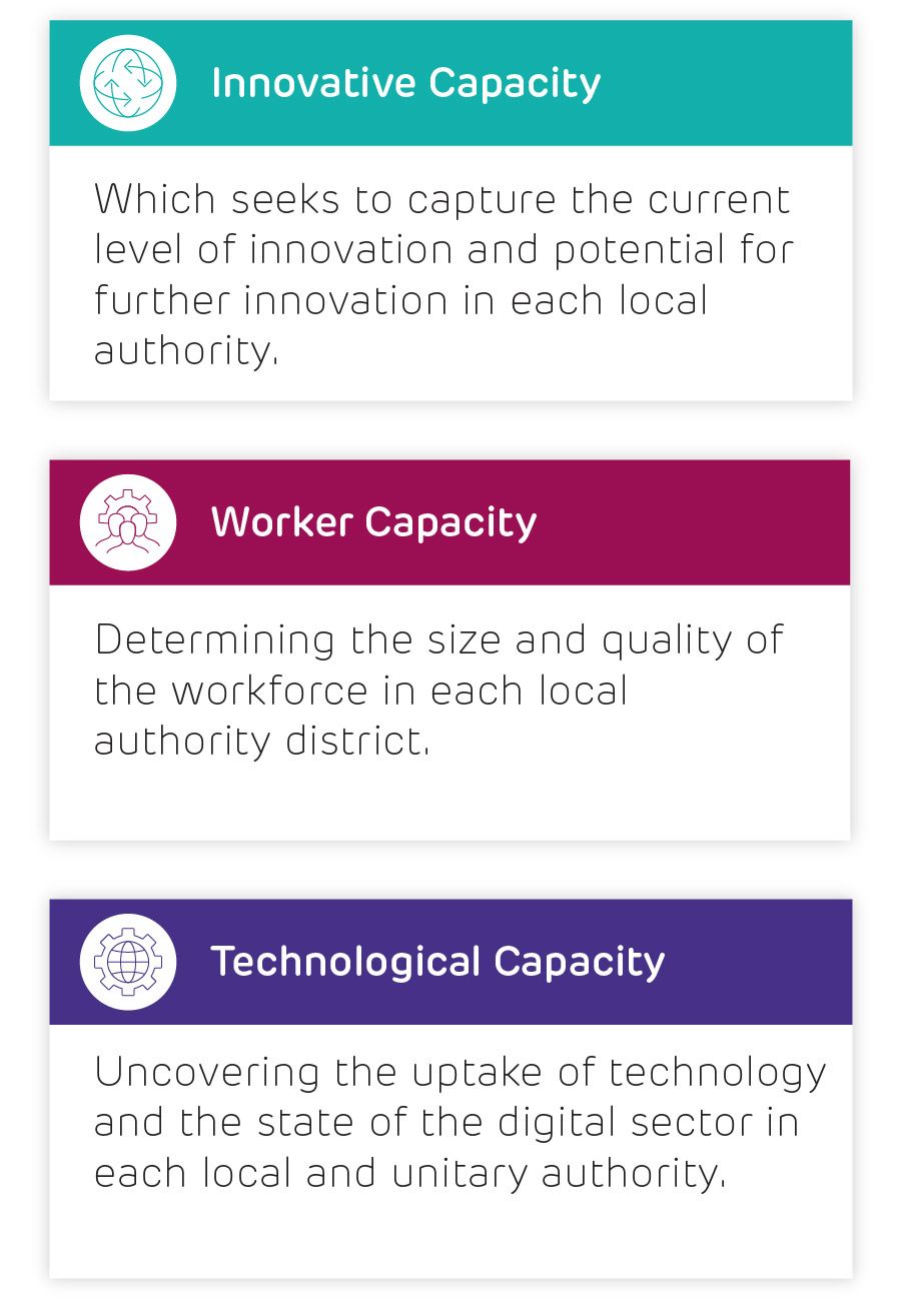 Whether it’s Scotland’s skilled workforce (reflected in its high Worker Capacity score), strong Innovation Capacity in the South West and North West, or the Technological Capacity in the East, there are locations ripe for investment across the UK.
