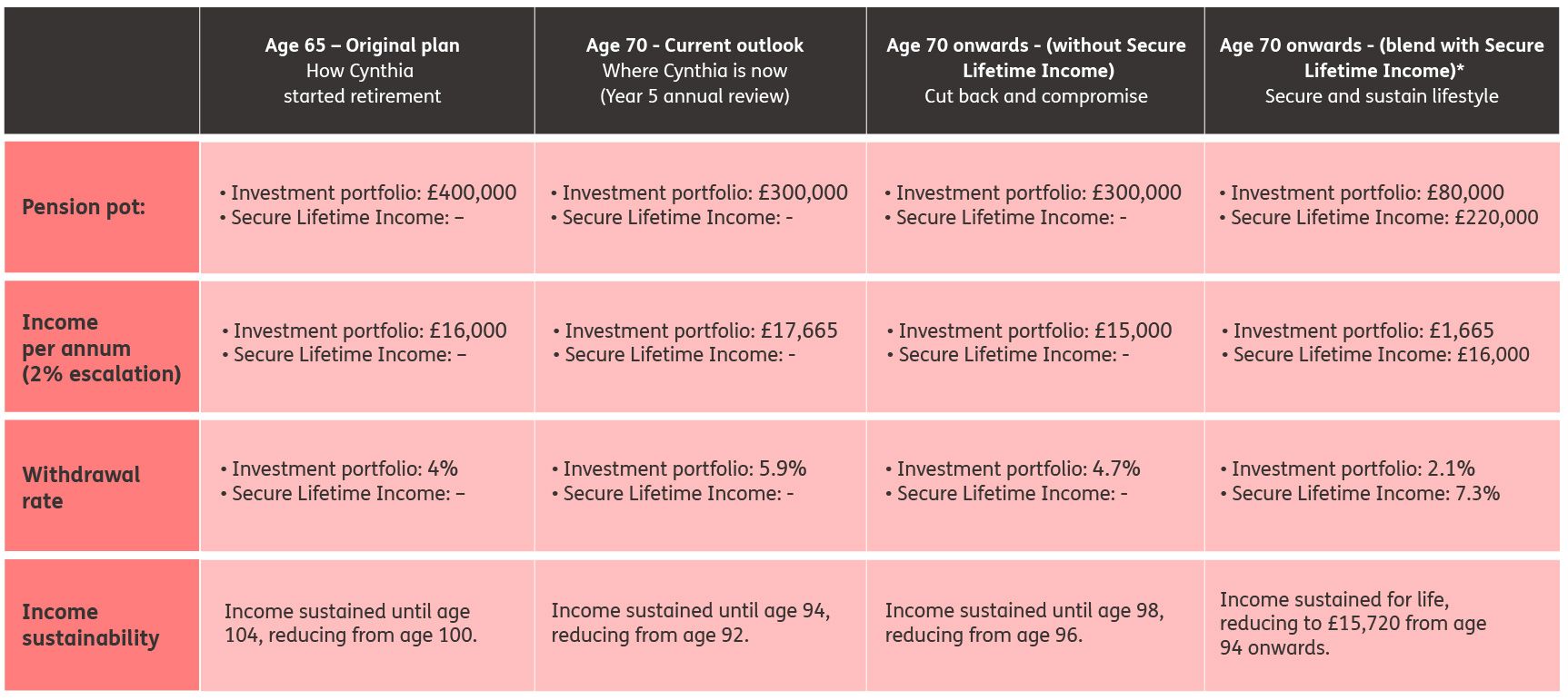 Secure Lifetime Income provides Cynthia with a reliable income stream that covers her essential needs. This allows her to reduce reliance on her drawdown pot, lowering the risk of premature depletion and giving her confidence to keep spending without unnecessary cutbacks.