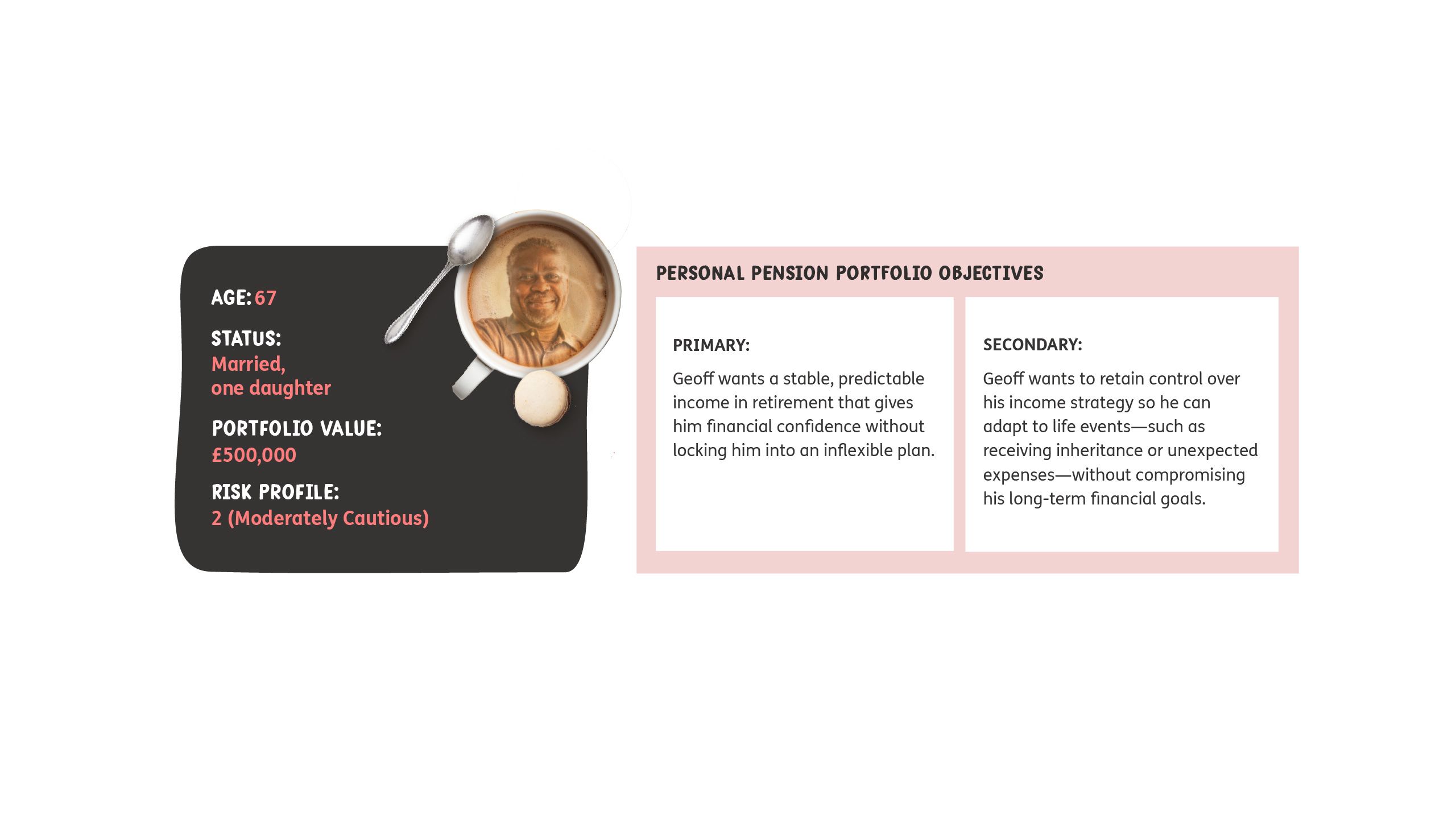 Secure Lifetime Income gives Geoff the emotional comfort of a regular income with the practical control of a drawdown product. By allocating a portion of his pension to Secure Lifetime Income within his SIPP, Geoff can: